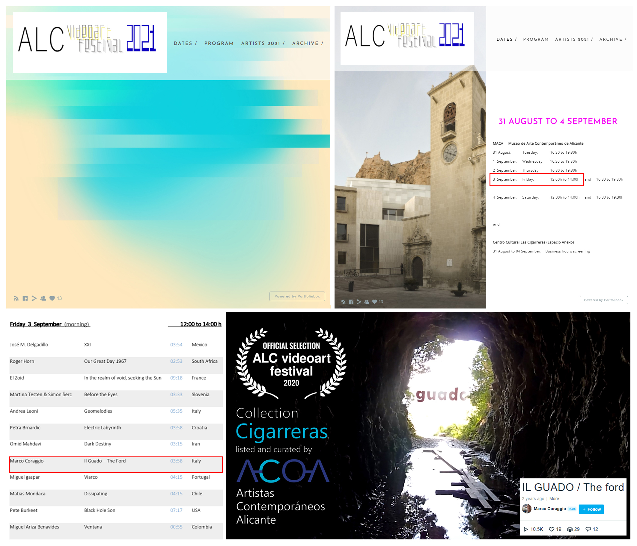 Alicante Videoart Festival 2021 – The film IL GUADO / THE FORD by Marco Coraggio, scheduled for last year’s edition festival, delayed due to the pandemic, was screened on Friday 3 September at the Las Cigarreras Cultural Center, with the realization of the MACA – Museum of Contemporary Art of Alicante and Associación ACOA . The event planned with the presence of spectators was organized and curated by David Delgado.